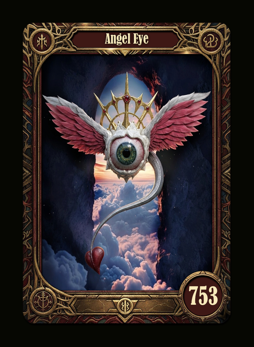Hovering high within the Aetherial Peaks, where the sky bleeds into a permanent twilight, Angel Eyes serves as a divine observer. This celestial entity is a singular, massive eye encased in a spined, golden halo that hums with ancient authority. Its vibrant, pink-feathered wings allow it to remain stationary against the most violent mountain gales, while its long, heart-tipped tail acts as a grounding wire for the immense celestial energy it channels from the stars.