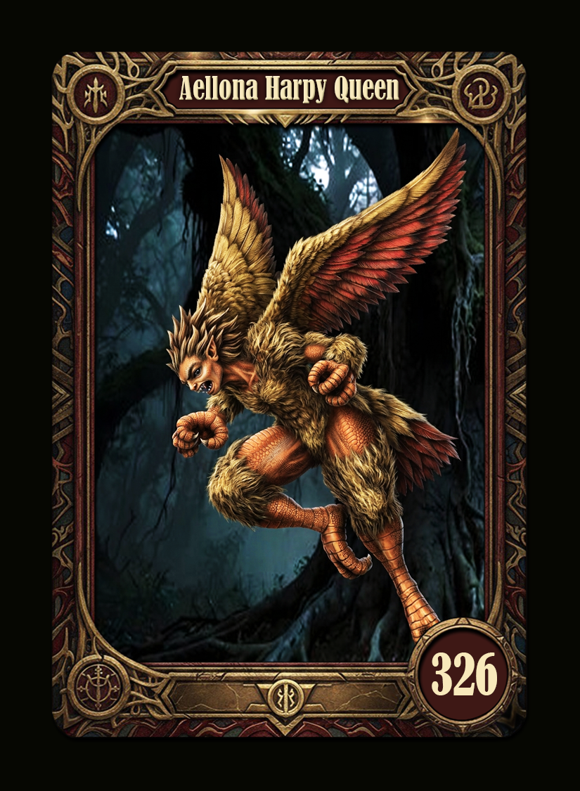 High above the clouds where the air is thin and the winds are razor-sharp, Aellona rules the skies with cold, calculating elegance. Clad in ornate, golden-trimmed armor that reflects the rising sun, she is a vision of lethal majesty. Her wings are vast and powerful, capable of generating gale-force winds with a single beat, and her talons are plated in enchanted silver to rend through the toughest dragon scale. Unlike common harpies, Aellona possesses a strategic mind that has allowed her to unite the warring mountain tribes under her golden banner.