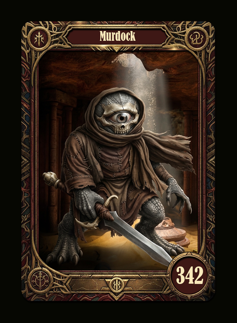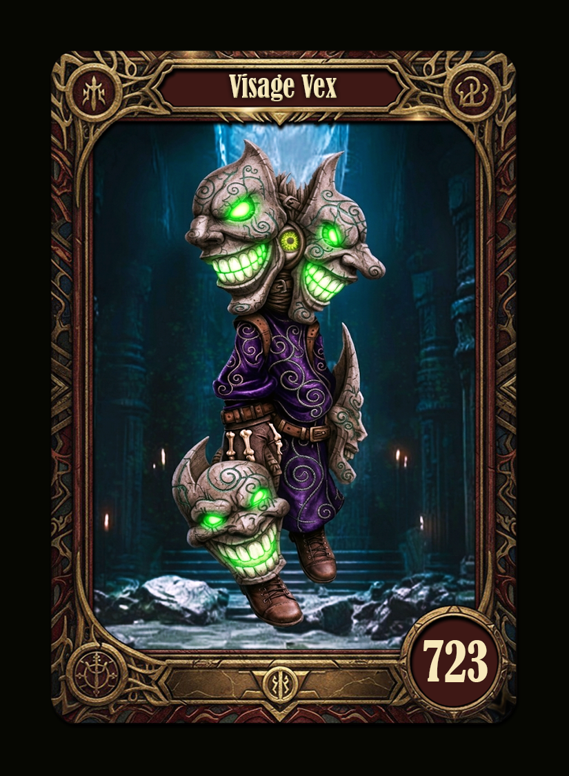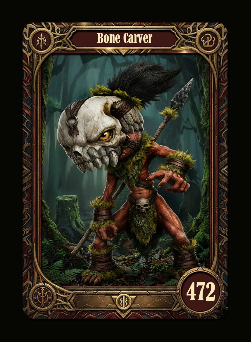 Deep within the shifting mists of the Ancient Burial Grounds, the Bone Carver thrives as a macabre artisan of the afterlife. This tribal entity wears a massive, stylized skull as a mask, its single yellow eye peering out with a calculating intensity. Clad in primitive furs and bone-bead ornaments, it wields a spear tipped with a razor-sharp shard of ancestral remains. The Bone Carver does not merely hunt; it harvests, viewing every fallen foe as raw material for its next grim masterpiece or ritual totem.