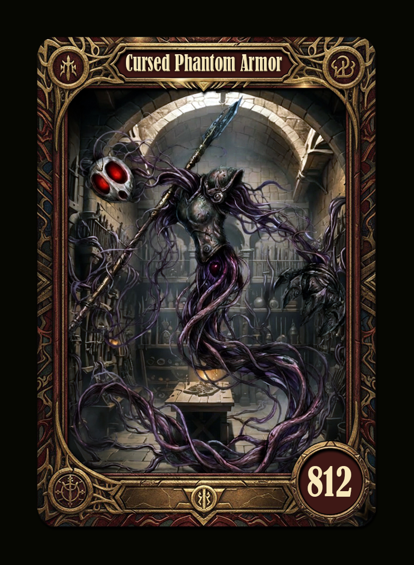The Cursed Phantom Armor is a haunting relic of a forgotten era, an empty suit of plate mail animated by a swirling mass of shadowy, ethereal vines. Once the regalia of a high-ranking commander, the armor is now a hollow shell inhabited by a restless spirit that manifests as thick, indigo-colored mist and grasping spectral roots. Its most unsettling feature is its detached helmet, which floats independently and houses two glowing crimson orbs that flicker with a malevolent intelligence. Stationed within the dim, cluttered shelves of a forbidden laboratory or a desecrated armory, it stands as a silent testament to a ritual that bound a soul to steel for all eternity.