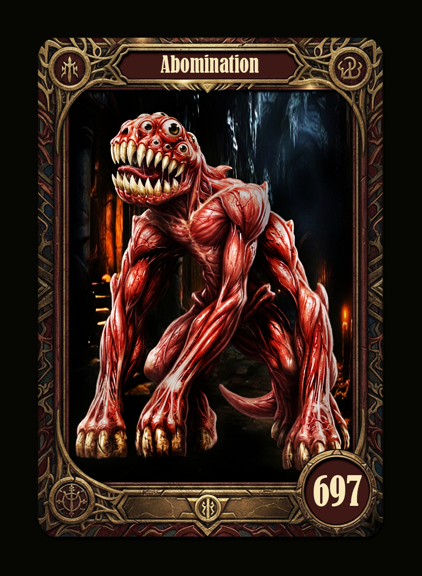 Emerging from the gore-slicked corridors of the Blood-Moon Sanatorium, the Abomination is a nightmare of biological experimentation gone horribly wrong. This hulking mass of exposed, corded muscle and raw sinew is driven by a primal, unending hunger. Its head is a chaotic cluster of lidless, yellow eyes that provide a 360-degree field of vision, ensuring it never loses sight of its prey. With a jaw filled with jagged, oversized teeth, it can tear through armor and bone with equal ease.