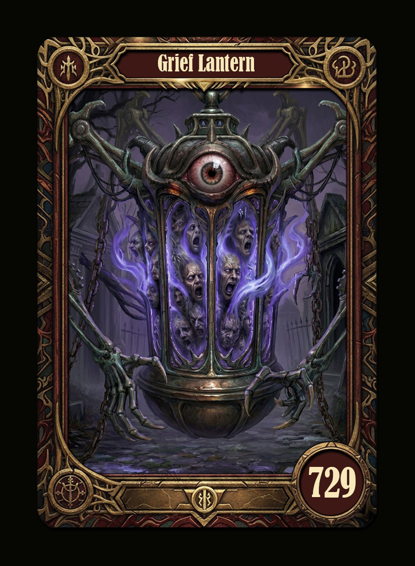 The Grief Lantern is a macabre construct that prowls desolated battlefields and forgotten graveyards, sustained by the literal anguish of the departed. Its central chamber acts as a spiritual furnace, containing a swirling mass of tormented souls whose silent screams provide a flickering, ghostly luminescence. Unlike traditional constructs, it is guided by the singular, lidless eye mounted upon its crest—a watchful organ that can sense a heartbeat from miles away, identifying the next "fuel" for its eternal flame.