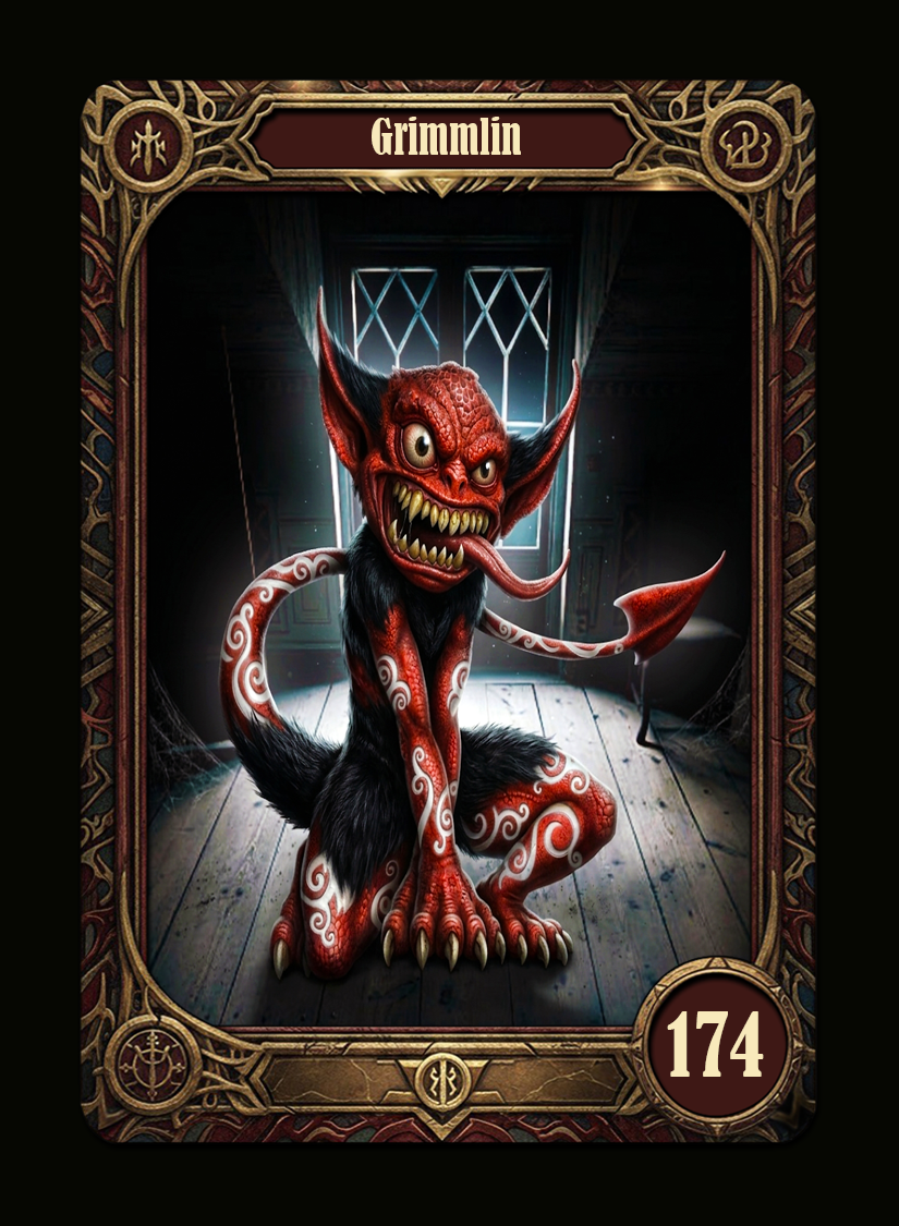 Whispered about in hushed tones to keep children from wandering into abandoned manors, the Grimmlin is a mischievous predator of the shadows. With vibrant red skin etched with glowing white runes and a tongue that flicks with unnatural speed, this creature is more than just a nuisance. It is a master of the "long prank," setting complex traps in the rafters and waiting days—or even weeks—for a victim to trip them.