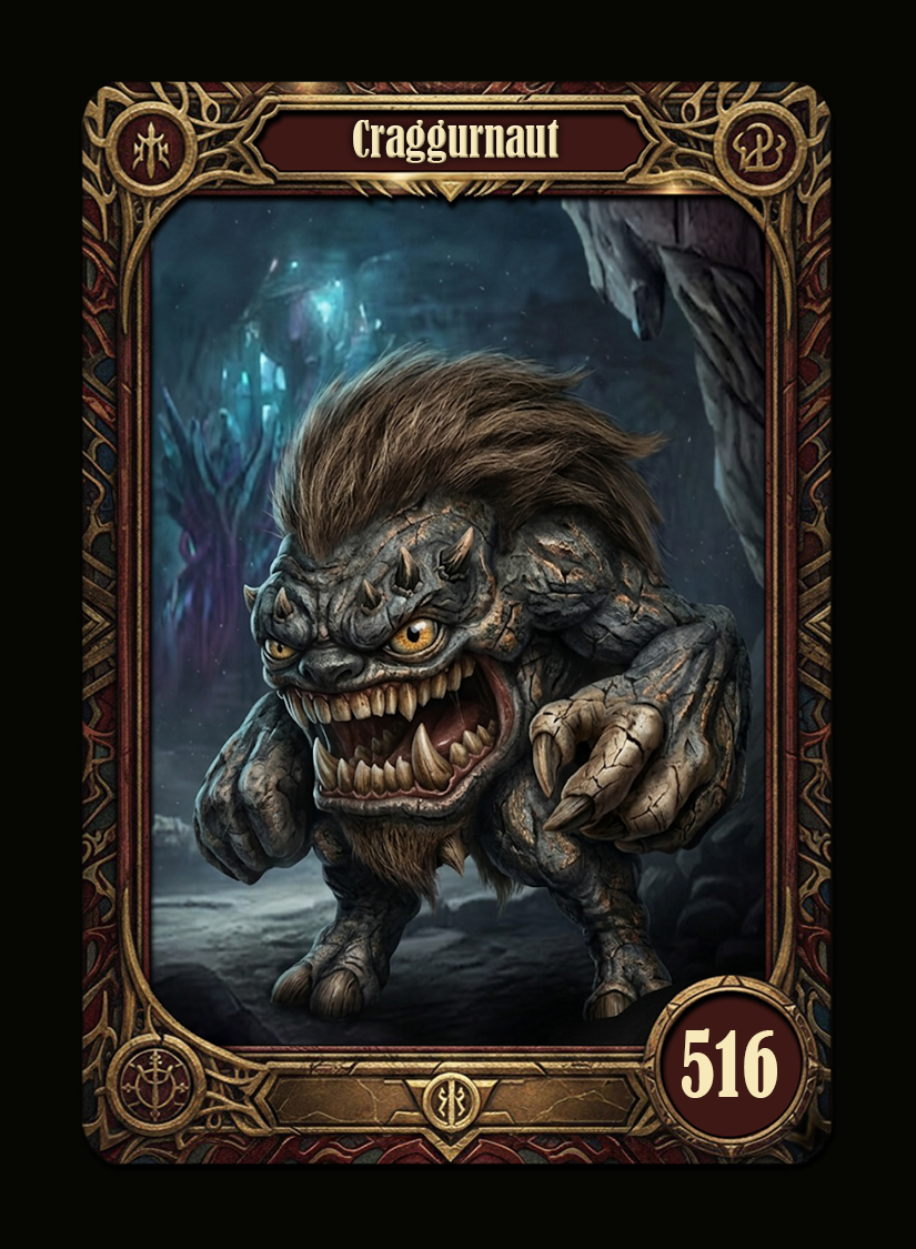 Lurking within the lightless depths of the Crystal Caverns, the Craggurnaut is a relentless force of geological fury. This squat, muscular entity is a living boulder, its skin a patchwork of jagged granite and obsidian veins that pulse with a faint, earthy energy. With a wide, tooth-filled maw and a wild mane of coarse hair, it possesses an insatiable hunger for the rare minerals found in the deep. It does not navigate the caves so much as it carves through them, using its immense, stone-hard fists to pulverize anything standing between it and its next meal.