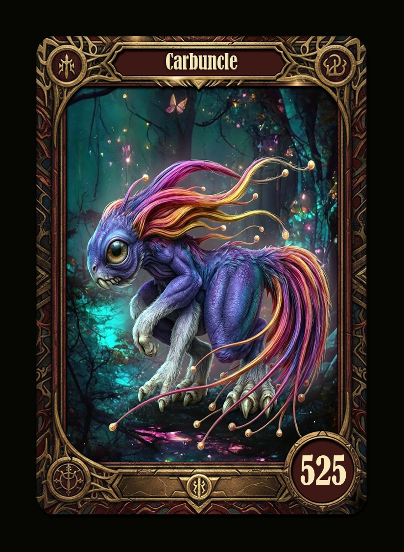 Deep within the luminescent groves of the Mycelium Wilds, the Carbuncle darts through the undergrowth like a streak of neon lightning. This small, agile creature is covered in a coat of brilliant cobalt fur that emits its own soft glow, while its multi-colored mane and tail flow behind it like ribbons of fire. Despite its small stature and large, curious eyes, the Carbuncle is a vital part of the forest's defense, acting as a living conduit for the magical energies that permeate the region.