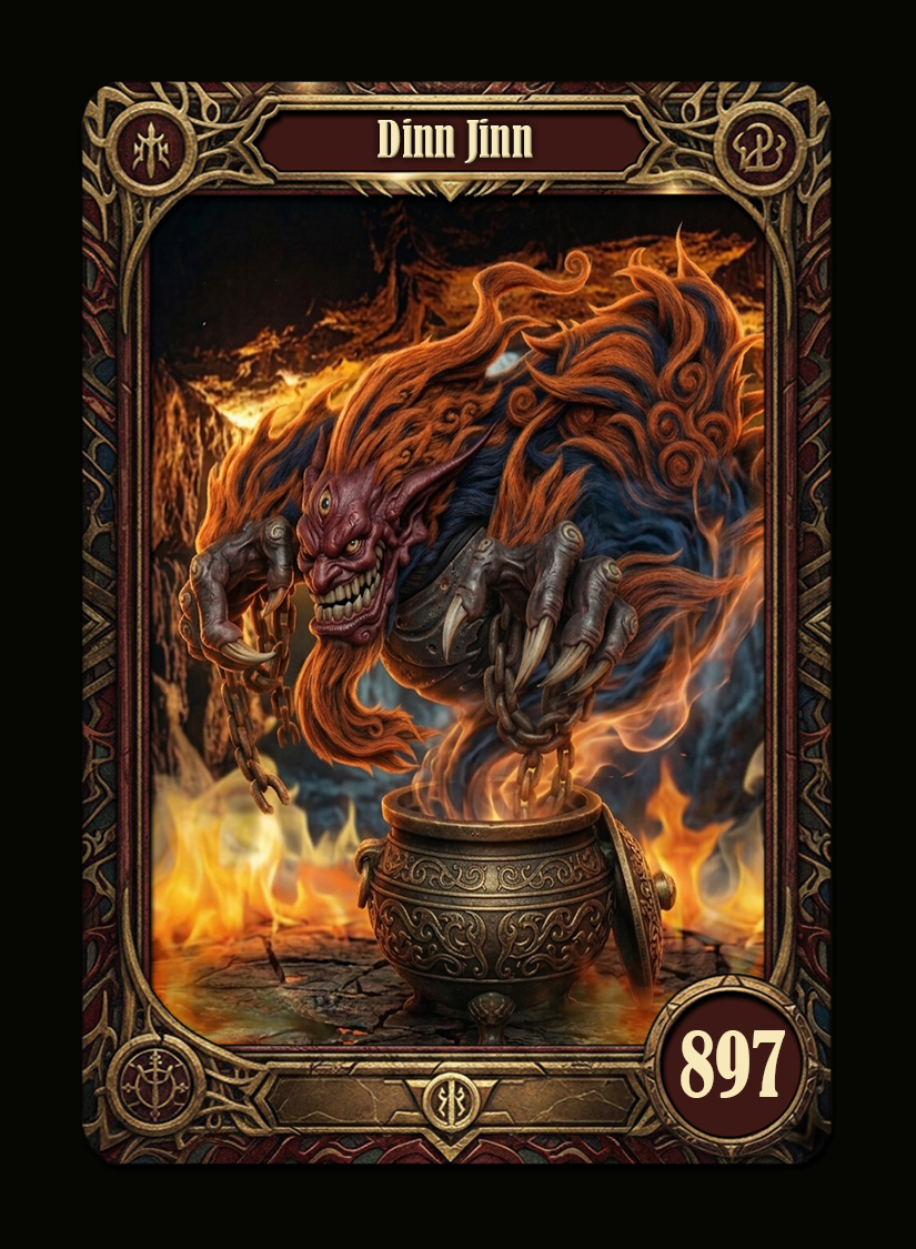 Chained within the searing heart of the Obsidian Vaults, Dinn Jinn is a primal force of destruction barely contained by enchanted iron. This massive, blue-skinned entity is wreathed in roaring orange flames that form a majestic, flowing mane. Unlike the more calculated Mad Magus Razzler, Dinn Jinn is a creature of pure, volatile emotion, lashing out with three glowing eyes that see through the veil of physical reality to target the very essence of its enemies.