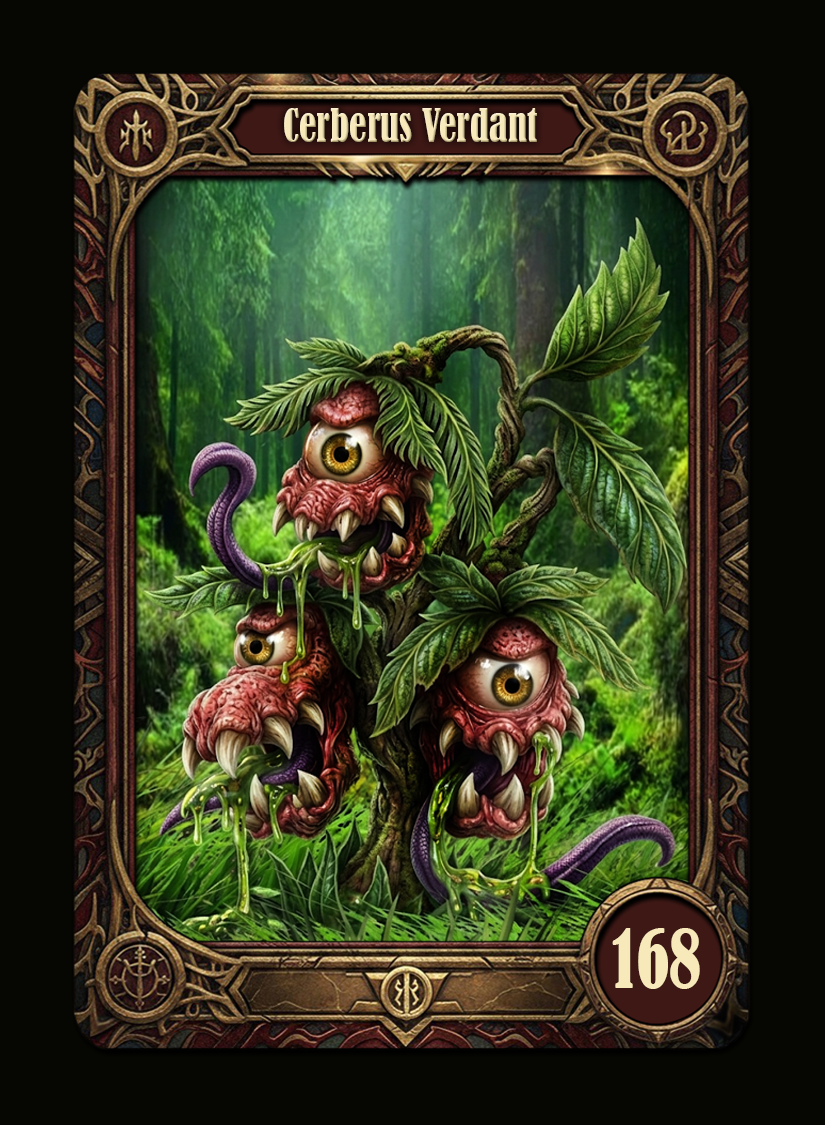 Deep within the emerald shadows of the Mycelium Wilds, the Cerberus Verdant thrives as a twisted mockery of the natural order. This botanical horror is not a single plant, but a sentient, parasitic growth that has hijacked a sturdy trunk to support its three bulbous, single-eyed heads. Each head drips with a thick, neon-green bile that dissolves organic matter on contact, allowing the creature to "digest" its prey before even swallowing.