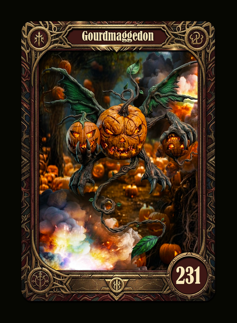 In its claws, it carries sentient, explosive jack-o'-lanterns that cackle with glee before they are hurled into enemy ranks. The Gourdmaggedon doesn't just want to win; it wants to turn the entire world into a charred, pumpkin-scented wasteland. It is the ultimate embodiment of "trick or treat," where the trick is an explosion and the treat is survival.