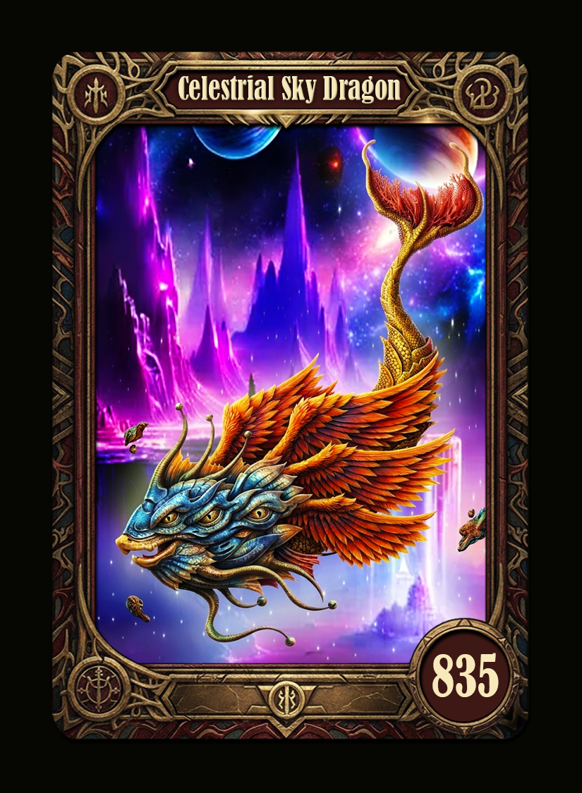 Gliding through the sea of stars where the air is thin and cold, the Celestial Sky Dragon is a creature of pure cosmic energy and ancient wisdom. Its scales are not made of keratin or bone, but of compressed starlight that shimmers with a spectrum of colors—ranging from deep nebulous purples to brilliant supernova golds. Its wings are immense, flowing ribbons of light that allow it to traverse the distance between moons in a single night.